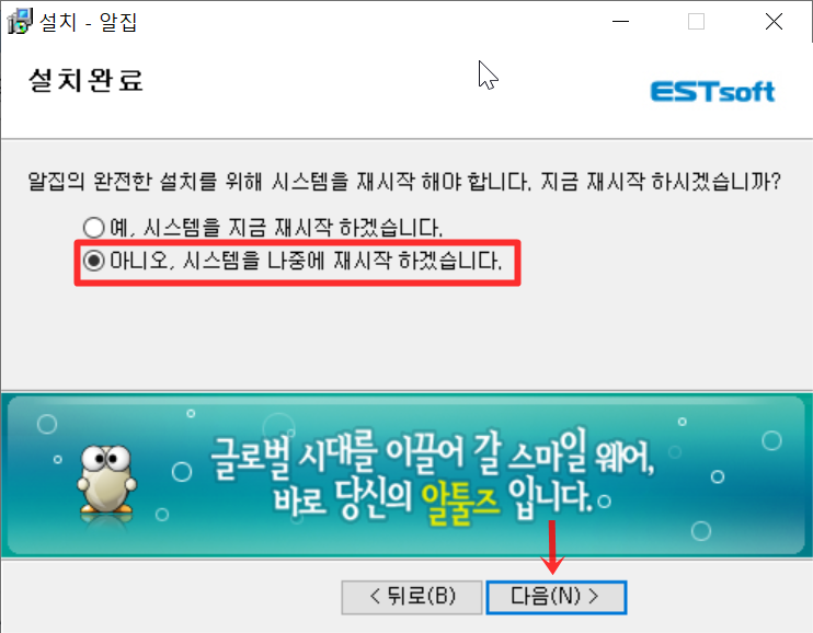 위와같이 "아니요, 시스템을 나중에 재시작하겠습니다." 선택후 다음 눌러주세요.