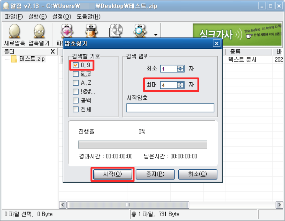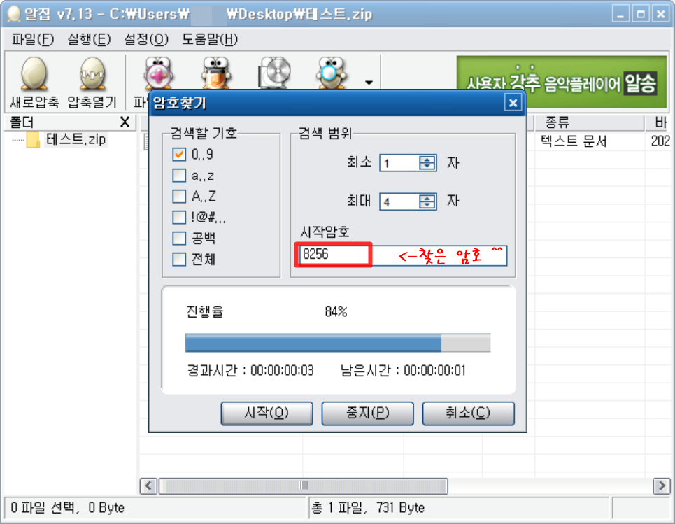 테스트해본결과 알집에서 제공하는 암호 찾기 기능은 검색하는데 상당한 시간이 걸립니다.