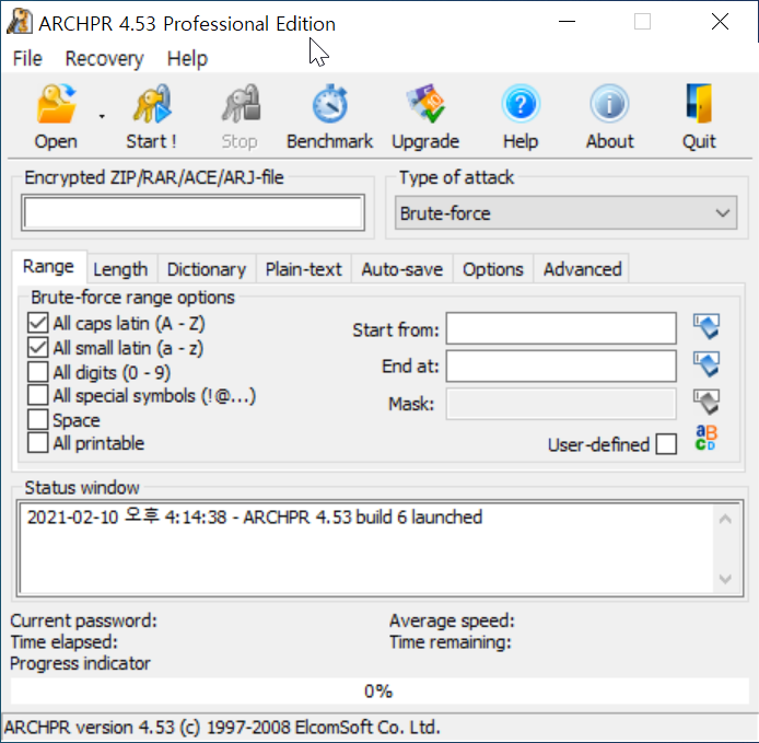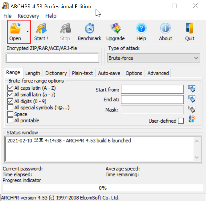 암호찾기 지원하는 파일형식은 rar, zip, ace, arj 압축 파일이에요.