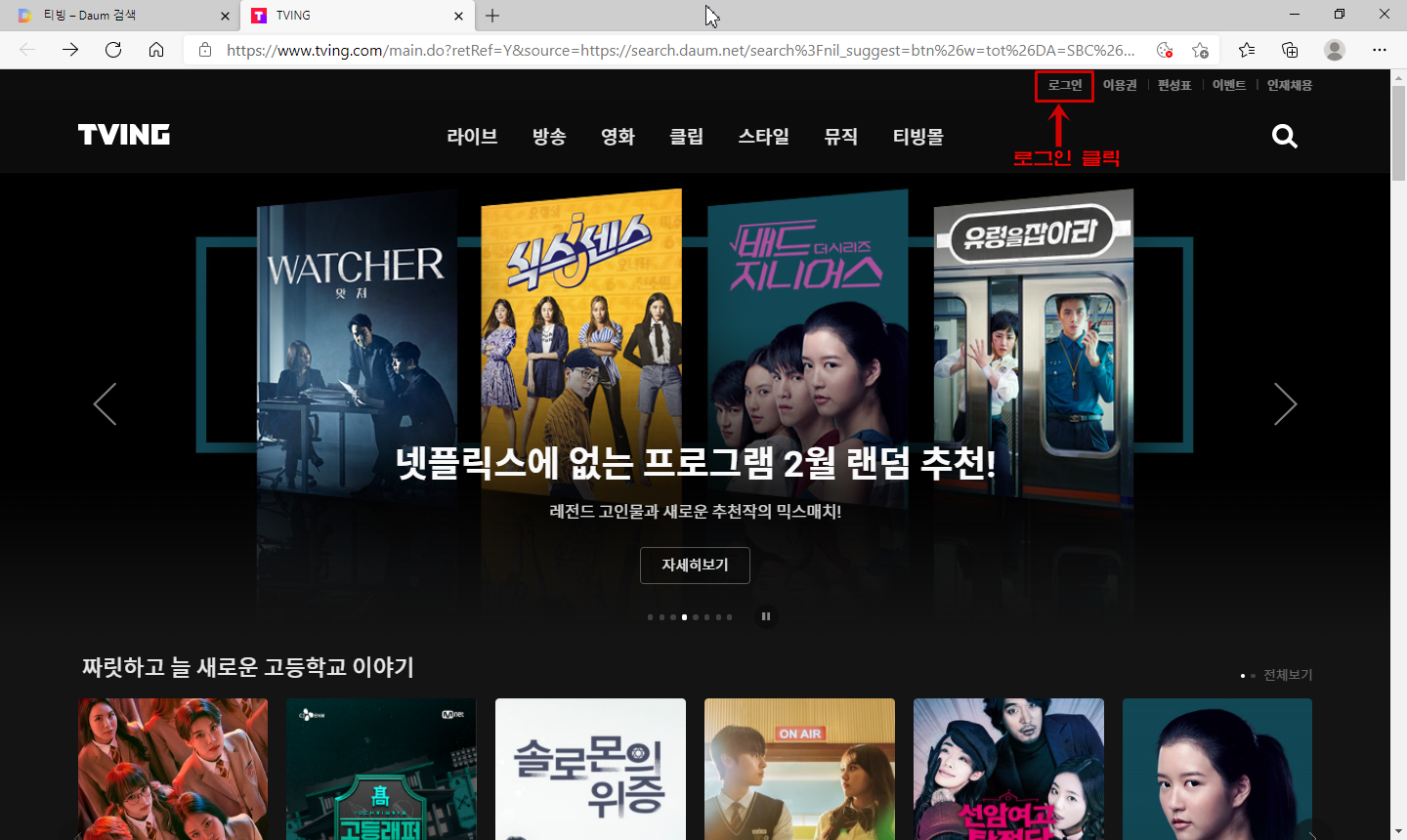1. Daum에서 "티빙" 치고 사이트로 들어가줍니다.