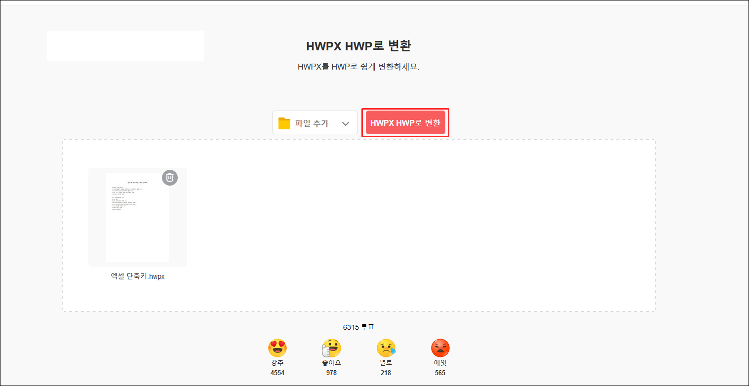 파일을 추가하면 붉은색 HWPX HWP로 변환 버튼이 활성화 되는데 클릭해줍니다.