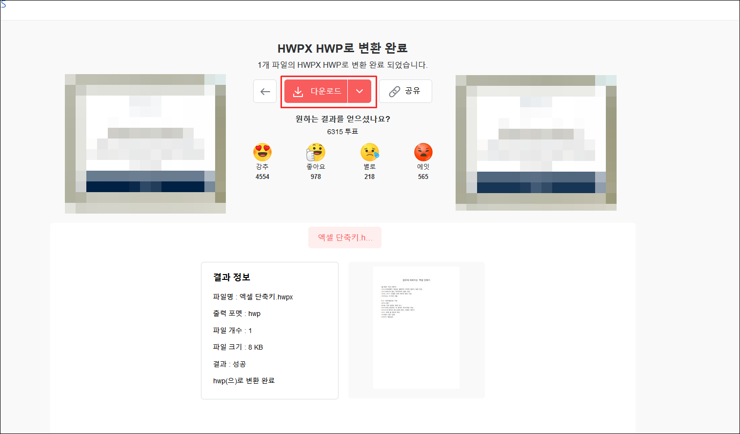 그리고 잠시기다리면 HWPX HWP로 변환 완료되고 뜹니다.