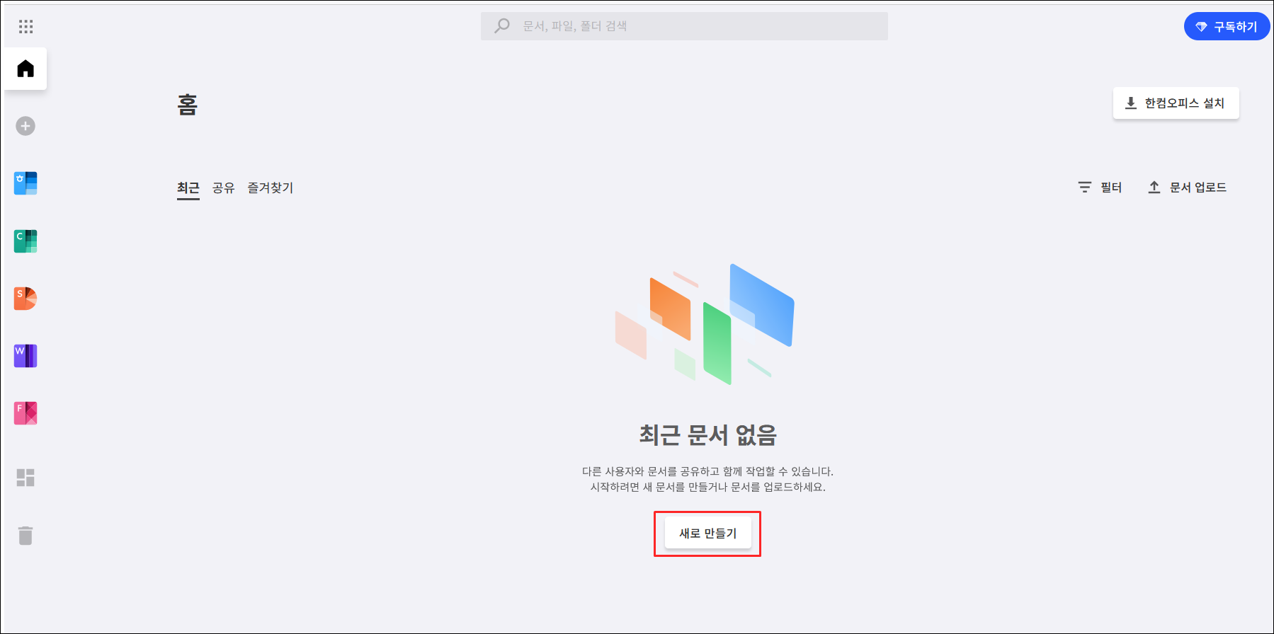 로그인을 하면 이런화면이 나오는데, 새문서를 만들거나 한글파일을 불러와서 편집할 수 있습니다.
