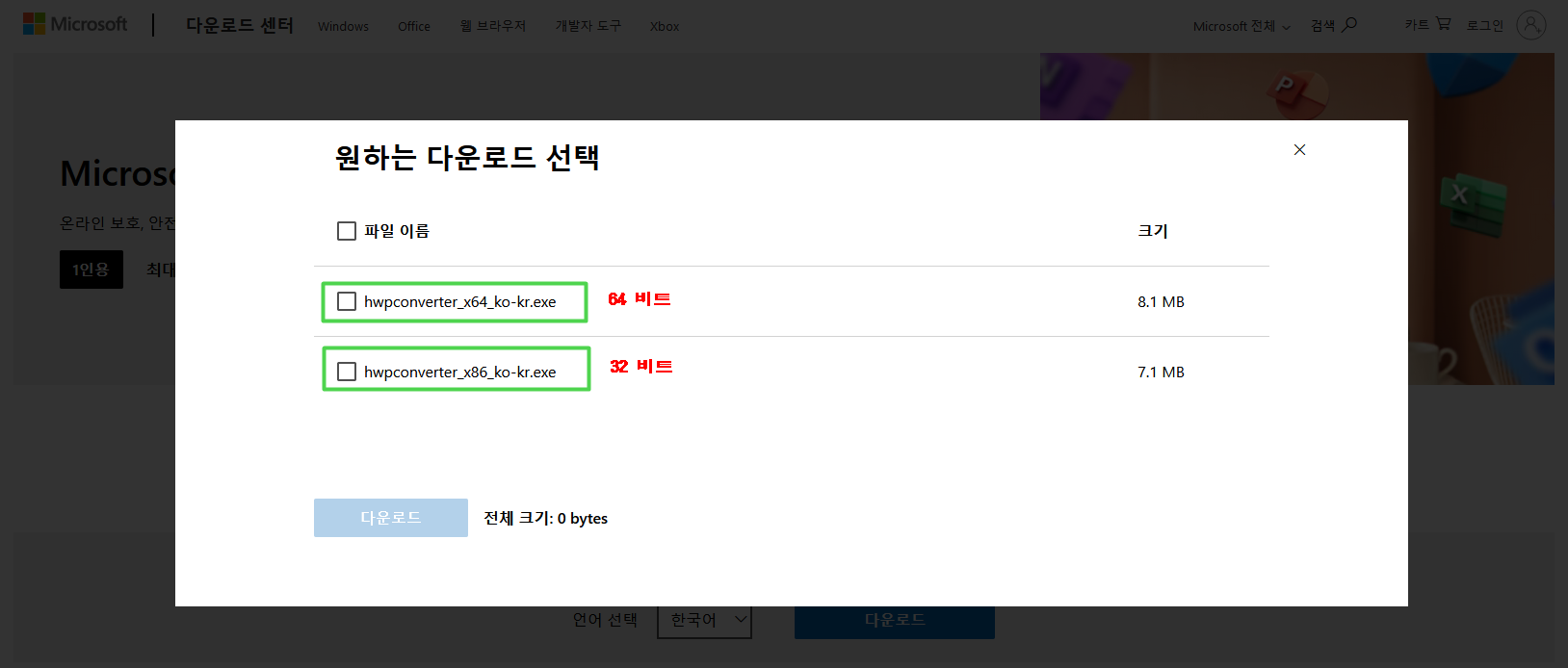 hwpconverter_x64_ko-kr.exe 는 64비트 용, hwpconverter_x86_ko-kr.exe 32비트용 입니다.