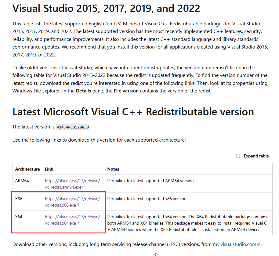 * [Visual C++ Redistributable 최신 버전 다운로드 페이지]( https://learn.microsoft.com/en-us/cpp/windows/latest-supported-vc-redist )에 접속합니다.